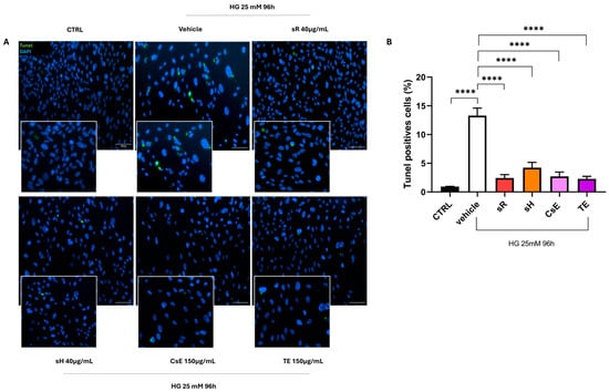 The different capacities of the various extracts to protect ARPE-19 cells from oxidative damage also emerge in Figure 4, which illustrates the integrity of cell junctions through the labeling of the tight junction-specific protein zonula occludens-1 (ZO-1). As shown in Panel A, the control group (CTRL) cells exhibit a well-defined green label along the cell membrane, highlighting the typical intersections of epithelial cells. Following exposure to oxidative stress, this label almost completely disappears in cells treated only with the vehicle, indicating a loss of junction integrity. In contrast, the panels related to treatments with different extracts show partial or complete preservation of the green ZO-1 label, suggesting a certain degree of protection against stress. The protective effect of the extracts was further quantified by measuring the fluorescence intensity of ZO-1. The bar graph in Figure 4B shows a significant protective effect for the sR, sH, and CsE extracts, while no statistically significant levels were reached for the extracts obtained from tepals alone (TE). The protective effect of saffron extracts on mitochondrial status, as well as on the preservation of cell junctions, reduces the apoptotic process by which cells are destined to die. Figure 5 shows the results obtained through TUNEL analysis, where Panel A displays a reduction in green labeling, indicating TUNEL+ cell nuclei, and Panel B quantifies the number of TUNEL+ cells expressed as a percentage. The bar graph in Panel B shows that treatment with the different tested extracts significantly reduces apoptotic cells.
