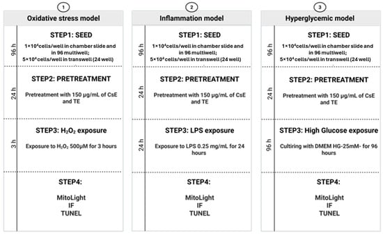 We tested the extract’s protective efficacy in three different retinal degeneration models using three experimental protocols (Figure 12): (1) H2O2 protocol: After 24 h of pretreatment, 500 µM H2O2 (Sigma-Aldrich, Merck, Darmstadt, Germany, starting concentration 0.89 M) was added to the wells and maintained for 3 h at 37 °C in 5% CO2 before a biochemical assay. (2) LPS Protocol: Lipopolysaccharide (LPS) derived from Escherichia coli was obtained from Sigma-Aldrich. A stock solution of LPS (1 mg/mL) was prepared in physiological saline and subsequently diluted to a working concentration of 0.25 mg/mL in DMEM-F12 (Merck, Darmstadt, Germany; cod. D6421). Cells were pretreated with extracts for 24 h as described above and subsequently exposed to LPS for 24 h before carrying out biochemical assays. (3) HG protocol: Cells were pretreated with extracts for 24 h. To induce high glucose stress, cells were incubated for 96 h by replacing the specific culture medium with Dulbecco’s modified Eagle’s medium-high glucose (DMEM-HG; Merck, Darmstadt, Germany; cod. D5671) supplemented by 10% fetal bovine serum (FBS; Merck, Darmstadt, Germany; cod. F9665), 1% penicillin–streptomycin (Merck, Darmstadt, Germany; cod. P4333), and the extracts at the concentration described above.