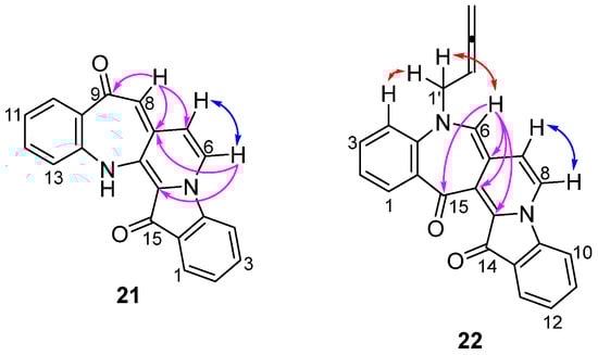 Key correlations in support of the structural elucidation of benzoazepinopyridoindolediones 21 and 22. The correlations observed by COSY, NOESY, and HMBC are annotated in blue, red, and magenta, respectively.