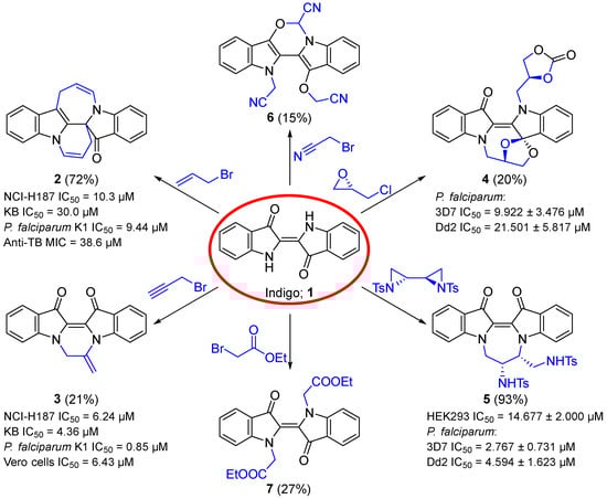 Examples of heterocyclic systems arising from indigo 1 cascade reactions with some reported biological activities. NCI-H187 = NCI small cell lung carcinoma, KB = KB oral cavity cancer, HEK293 = human embryonic kidney 293 cells, Vero cells: African green monkey kidney tissue, malaria = Plasmodium falciparum drug-resistant K1 or Dd2 strain and drug-susceptible 3D7 strain, anti-TB = Mycobacterium tuberculosis.