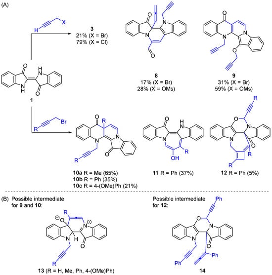 - Ali, S.; McCosker, P.M.; Willis, A.C.; Pyne, S.G.; Richardson, C.; Bremner, J.B.; Keller, P.A. Mapping of some further alkylation-initiated pathways to polyheterocyclic compounds from indigo and indirubin. Molecules 2024, 29, 4242. [Google Scholar] [CrossRef] [PubMed]