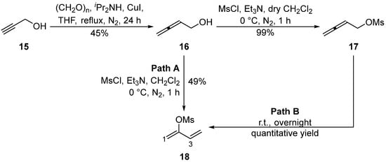 The allenylic electrophile was synthesized in two steps by converting alkyne 15 to allenol 16, followed by mesylation to generate buta-2,3-dien-1-yl methanesulfonate 17 in 45% yield over two steps (Scheme 3) [20]. Interestingly, the new 2-functionalized 1,3-diene 18 was isolated as a by-product if non-anhydrous dichloromethane was used as the solvent during the mesylation step with buta-2,3-dien-1-ol 16 (Path A, Scheme 3) or if the buta-2,3-dien-1-yl mesylate 17 was stored overnight at room temperature (Path B, Scheme 3).