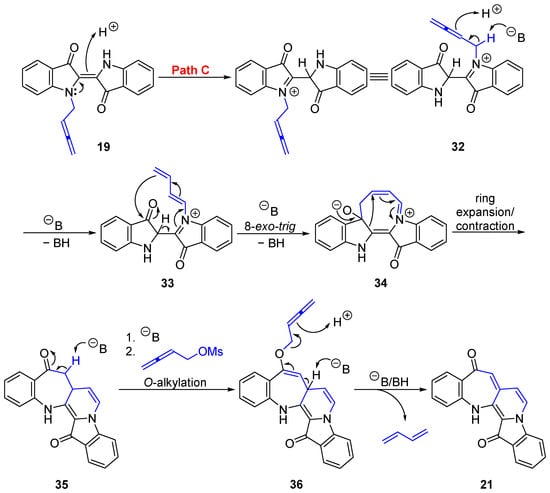 The proposed mechanism for the formation of benzoazepinopyridoindoledione 21 starts from the key compound 19 (Scheme 6). N-Buta-2,3-dien-1-ylindigo 19 could undergo protonation to 32 (Path C) with subsequent base-induced isomerization to afford the 1,3-diene intermediate 33. Intramolecular 8-exo-trig cyclization onto the indolone carbonyl to give 34, followed by ring expansion of one indoline unit with concomitant ring contraction of the 8-membered ring, would give the fused 7-membered intermediate 35. Subsequent O-alkylallenylation to 36, and a final deprotonation with buta-1,3-diene expulsion gives benzoazepinopyridoindoledione 21. This compound contains one free NH in the structure and represents a new and unique complex heterocycle scaffold.