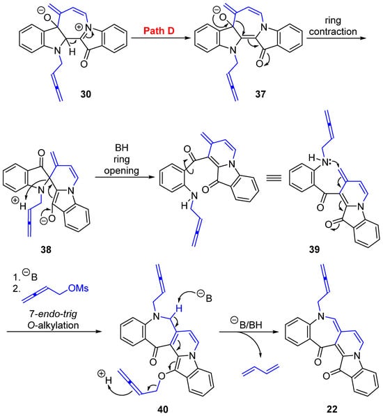 The benzoazepinopyridoindoledione 22 formation is derived from the key seven-membered ring intermediate 30 (Scheme 5; R = allenylmethyl) following Path D (Scheme 7). Proton loss would afford 37, which is then set up for a ring contraction to give the spiro intermediate 38. Ring opening then allows for rotation about the C-CO bond to give 39, with groups appropriately positioned for a 7-endo-trig cyclization through nitrogen attack on the terminal alkene, with further O-alkylallenylation to furnish 40. Such ring contractions followed by ring opening have previously been demonstrated in the formation of pyrrolodione from indigo 1 propargylation using 3-phenylpropiolaldehyde [10]. In the final step, deprotonation drives the extended conjugation to release buta-1,3-diene and affords the novel structural motif of benzoazepinopyridoindoledione 22. Mechanistically, the formation of all cascade outcomes from indigo 1 buta-2,3-dien-1-ylation is supported by prior studies under comparable reaction conditions and consistent with the unifying mechanistic proposals for cascade reactions of indigo, e.g., reaction of propargyl and/or allyl moieties with indigo 1 [5,8,9,10]. These findings also support the allenic intermediate formed from previous indigo 1 propargylations and further expand the wider understanding of the mechanistic pathways of indigo 1 cascade reactions.