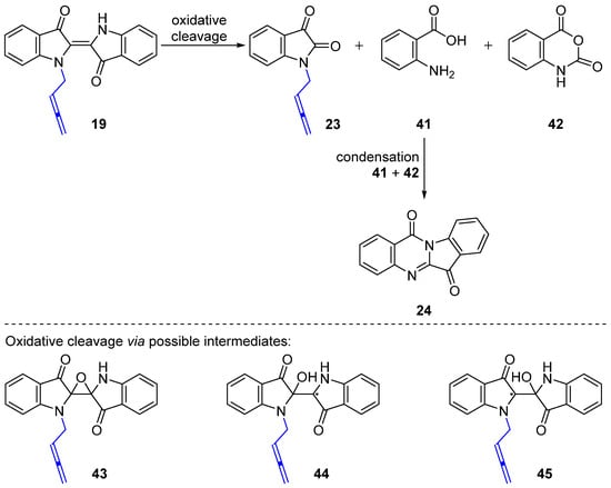 The N-buta-2,3-dien-1-ylisatin 23 and tryptanthrin 24 are likely to be formed from the oxidative cleavage of the N-allenylmethylindigo 19 under basic conditions with buta-2,3-dien-1-yl mesylate 17, as described in Scheme 8. As previously reported, the decomposition of indigo 1 derivatives via oxidative cleavage can arise in the presence of oxidants or bases to generate isatin or derivatives, for example 23, as well as anthranilic acid 41, or isatoic anhydride 42, which can further condense to yield tryptanthrin 24 [28,29]. Based on previous proposals [30,31,32] and with possible traces of atmospheric oxygen present during the reaction, the potential intermediates in the fragmentation process are suggested to be derived from initial triplet oxygen addition to the central double bond in 19. This includes the epoxide 43, and the stabilized radicals 44 and 45, although these may also be formed by hydroxyl radical attack on 19. A longer reaction time with excess buta-2,3-dien-1-yl mesylate 17 at a high temperature (>85 °C) is likely to contribute to the cleavage process in comparison with milder conditions (<85 °C), where no oxidation outcomes were observed.