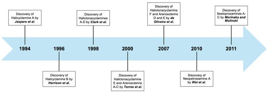 Within alkaloids, the tetracyclic bis-piperidine alkaloids (TcBPAs) have emerged as a particularly intriguing subgroup, predominantly isolated from marine sponges within the family Haplosclerida [7]. A timeline highlighting key milestones in the discovery of TcBPAs is presented in Figure 1. First identified from marine sponge extracts in the 1990s [8], TcBPAs are characterized by their distinctive bis-piperidine units integrated into tetracyclic macrocyclic frameworks. The various subclasses of TcBPAs, including halicyclamines, haliclonacyclamines, and arenosclerins, differ primarily in ring size, saturation, and stereochemistry [9]. TcBPAs have gained particular interest due to their selective antiproliferative activities against leukemia and melanoma cell lines, demonstrating potent low micromolar effects and highlighting their potential as anticancer lead compounds. This review comprehensively explores recent advancements regarding TcBPAs, with a detailed focus on their chemical structures, biosynthetic hypotheses, synthetic methodologies, and biological activities, emphasizing their therapeutic relevance and future promise.