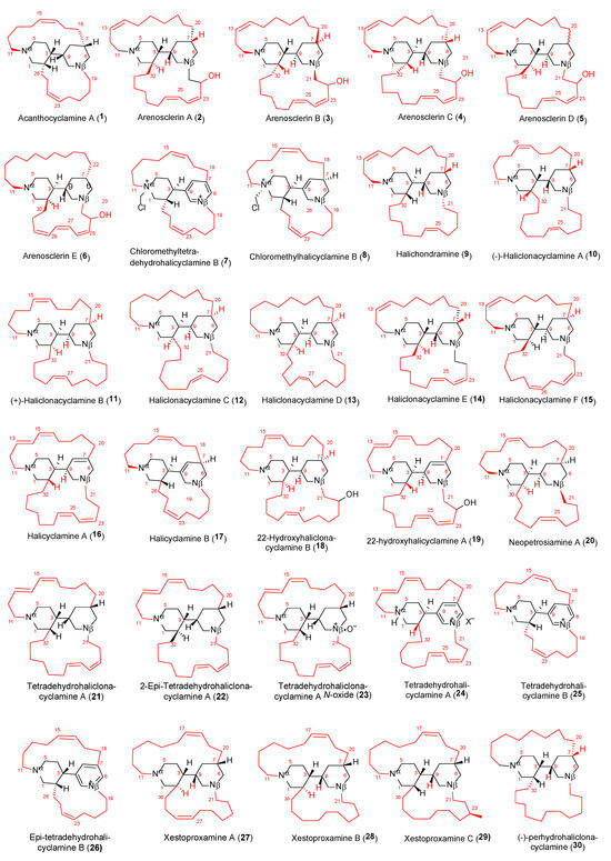 TcBPAs are defined by a central 3,9-linked bis-piperidine core, flanked by two aliphatic macrocyclic chains. This core features two substituted piperidine rings connected via two hydrocarbon linkers that vary in length, degree of unsaturation, and functionalization. The resulting structure forms a fused heterocyclic–carbocyclic tetracyclic framework containing two nitrogen atoms. To date, 27 naturally occurring TcBPAs (1–6, 9–29, Figure 2) have been isolated from marine sponges, along with two chloromethylated derivatives (7 and 8) identified as isolation artifacts resulting from reaction with dichloromethane. These compounds share a conserved tetracyclic bis-(3-alkylpiperidine) skeleton but differ in spacer chain composition and stereochemistry in the bis-piperidine core. The aliphatic bridges typically range from 8 to 12 carbon atoms and may contain zero to three double bonds, whose number and location contribute to the structural and functional diversity within the class. For example, haliclonacyclamines A–F (10–15) generally possess C10 and C12 linkers, while halicyclamine B (17) features two shorter C8 chains. Neopetrosiamine A (20) contains one C10 and one C12 chain, each with internal Z-configured double bonds at Δ15,16 and Δ25,26. Similarly, halicyclamine A (16) includes conjugated dienes in both linkers, and arenosclerin E (6) is distinguished by an unusual (25Z,27Z,29Z)-triene motif in its C10 bridge.