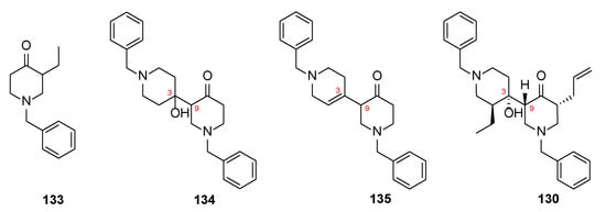 As illustrated in Table 3 [9,10,12,14,16,18,19,20,21,22,23,24,42], TcBPAs exhibit potent antiproliferative effects across various cancer cell lines, including leukemia, melanoma, breast, colon, fibrosarcoma, and glioblastoma. These compounds typically achieve efficacy at low micromolar concentrations and demonstrate selectivity by sparing healthy cells, as exemplified by neopetrosiamine A (20), which shows minimal toxicity toward healthy VERO cells (IC50 96 µM) [14]. It should be noted that all documented IC50 values thus far fall within the low micromolar range, highlighting TcBPAs’ potential as candidates for novel leukemia and melanoma therapeutics [43]. This potency may partly result from their macrocyclic structures, enabling interaction with biological targets inaccessible to smaller molecules and traditional treatments [44]. Banwell et al. [40] synthesized and evaluated four open-chain tetra-alkylated 3,9-linked bis-piperidine analogs (130, 133–135, Figure 3), which exhibited only moderate inhibition at a single high concentration (20 µM) against thirteen human cancer cell lines. Among these, compound 130, featuring C-2 and C-7 alkyl substitutions, exhibited superior inhibitory activity against multiple cancer types. These findings suggest that while the 3,9-bis(piperidine) moiety may serve as a pharmacophore, the absence of macrocyclic rings reduces potency, and the length of alkyl substitutions significantly influences biological activity. However, since IC50 values were not determined, direct comparison with TcBPAs, whose IC50 values fall within the low micromolar range, is limited. Structural differences, including the presence of polar ketone and hydroxyl groups on the core in the intermediates, may further impact their bioactivity and metabolic stability.