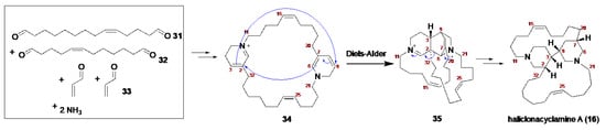The bioinspired synthetic pathway proposed for halicyclamine A (16) (Scheme 1) begins with the reductive coupling of two long-chain dialdehydes (31 and 32) with two equivalents each of acrolein (33) and ammonia. This sequence was proposed by Jaspars on the grounds of the Baldwin–Whitehead hypothesis [8]. This coupling generates a tricyclic precursor (34), which undergoes a Diels–Alder cyclization to yield a xestocyclamine/ingenamine-type structure (35) (Scheme 1) with a cis relationship between H-3 and H-9. A retro-Mannich-type fragmentation at the C2-C6 bond initiates a rearrangement that forms a C1-C2 double bond, which is stabilized by resonance and subsequently reduced to halicyclamine A. This pathway integrates early-stage aldehyde-ammonia condensation, endo-selective Diels–Alder cycloaddition, and late-state ring remodeling [26,28].