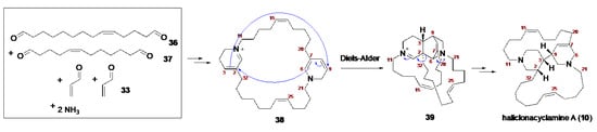 Similarly, the bioinspired synthetic pathway for haliclonacyclamine A (10), outlined by Charan [20] and shown in Scheme 2, follows the Baldwin–Whitehead paradigm. Two equivalents of acrolein (33) molecules condense with two long-chain (12 and 14 carbon atoms, respectively) monounsaturated dialdehydes (36 and 37) and two equivalents of ammonia to form a partially reduced bis(3-alkylpyridine) macrocycle (38). Diels–Alder cyclization sets the cis-H3/H9 stereochemistry in 39, and an intramolecular rearrangement of 39 via a retro-Mannich-type fragmentation cleaves the C2-C6 bond, generating the haliclonacyclamine core. The final steps involve the reduction of the C6-N and C1-C2 double bonds formed during the rearrangement and hydrogenation of the C7-C8 double bond formed during cyclization.