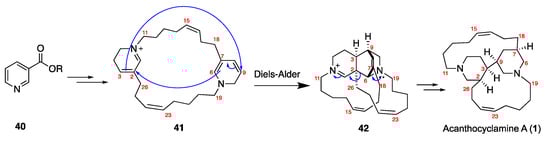 In the case of acanthocyclamine A (1), the pathway proposed by Dewi et al. and illustrated in Scheme 3 [17] builds on earlier insights by Cutignano et al. [29]. Here the core precursor is a nicotinic acid derivative (40), which incorporates successive two-carbon units via the polyketide pathway. Following decarboxylation transformations, the growing chain forms a macrocyclic intermediate 41, which undergoes an endo-Diels–Alder cyclization, generating a pentacyclic intermediate 42 in which H-3 and H-9 adopt a cis configuration. The final conversion to acanthocyclamine A (1) involves a ring-opening process that induces C2-C6 bond cleavage through a retro-Mannich-type fragmentation, the reduction of the resulting iminium cation, and the hydrogenation of the C1-C2 and C7-C8 double bonds.