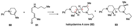 In a key study, the Marazano research group [31] applied this model to the proposed bioinspired synthesis of halicyclamine A (16) (Scheme 4). They postulated that the macrocyclic intermediate 49, containing both dihydropyridinium and aminopentadienal units, could form a polycyclic intermediate, representing an advanced bioinspired synthetic precursor to halicyclamine B and, by extension, halicyclamine A. To test this, they developed a model reaction (Scheme 5) where an aminopentadienal derivative (51) condenses with a partially reduced pyridinium salt (50) to yield an aminal. Subsequent acid treatment (methanesulfonic acid) and reduction (NaBH4) furnished adducts 52 and 53, with compound 52 resembling the halicyclamine scaffold. They further proposed that partially reduced pyridinium salts like intermediate 50 may serve as bioinspired synthetic precursors to haliclonacyclamines A–C (10–12).