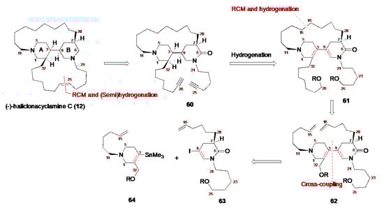 A pioneering total synthesis of TcBPAs was reported by Smith and Sulikowski at Vanderbilt University in 2010 for racemic haliclonacyclamine C (12) and its derivative tetrahydrohaliclonacyclamine A (89) [37,38]. The convergent retrosynthetic analysis, as shown in Scheme 7, relied on assembling two key fragments: an iodoenamine (63) and an alkylated vinyl stannane (64). These fragments were coupled via a Stille reaction to afford the bicyclic tetraene precursor (62). The fragment C26-C32 was incorporated by a Tsuji-Trost reaction. The C15-C16 bond was constructed via an olefin metathesis using Grubb’s first-generation catalyst followed by catalytic hydrogenation to yield tricyclic intermediate 61. The terminal diyne functionality was constructed by oxidizing the primary alcohol groups in 61 with Dess–Martin periodinane followed by reacting with Bestmann–Ohira reagent. Subsequent reduction with Red-Al yielded diamine diynes, which underwent methylation and reaction with sodium thiophenoxide to produce methylated diamine intermediate 60. This precursor was then subjected to a molybdenum-catalyzed alkyne metathesis followed by a Lindlar reduction to yield the target alkaloid haliclonacyclamine C (12).