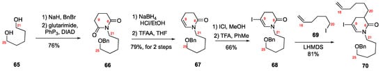The synthesis of the iodoenamine precursor (70), as illustrated in Scheme 8, begins with the benzylation of diol 65 to protect one of its hydroxyl groups, yielding 5-benzyloxypentanol. A subsequent Mitsunobu reaction with glutarimide installs the imide moiety, affording glutarimide 66, which is then reduced with sodium borohydride to give an alcohol. Elimination of the hydroxyl group mediated by trifluoroacetic anhydride (TFAA) furnishes the corresponding enamine 67. The treatment of enamine 67 with iodine monochloride in methanol induces a regioselective iodomethoxylation, resulting in a methoxyiodo amide intermediate. Subsequent brief exposure to catalytic trifluoroacetic acid (TFA) in refluxing toluene promotes the elimination of methanol, furnishing the iodoenamide 68 via the re-establishment of the enamine double bond. In the final step, compound 68 is deprotonated with LiHMDS in THF to generate a nucleophilic species, which undergoes electrophilic substitution with 6-iodo-1-hexene (69), delivering the targeted iodoenamine precursor 70. This multistep route results in an overall yield of 31% [37,38].