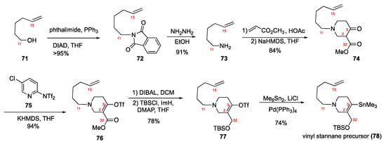 As illustrated in Scheme 9, the synthesis of the vinyl stannane precursor 78 begins with a Mitsunobu reaction between 5-hexen-1-ol (71) and phthalimide, affording compound 72. The treatment of 72 with hydrazine in ethanol cleaves the phthalimide group, yielding primary amine 73. This intermediate undergoes two sequential Michael additions, followed by intramolecular cyclization promoted by NaHMDS to furnish β-keto ester 74. Subsequent triflation with 75 affords compound 76, which is reduced with DIBAL-H followed by hydroxyl protection to produce compound 77. A final palladium-catalyzed stannylation using hexamethyldistannane provides the desired vinyl stannane precursor 78. The overall yield for this eight-step sequence is 29% [37,38].