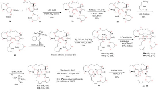 As shown in Scheme 10, the two key precursors, iodoenamine 70 and vinyl stannane 78, underwent a Stille cross-coupling to afford intermediate 79, which upon the removal of the TBS protecting group followed by acylation yielded 80. A subsequent Tsuji-Trost reaction of 80 with 81 produced the ring-closing metathesis substrate 82, a diene that was subjected to ring-closing alkene metathesis mediated by catalyst 83 to form the tricyclic tetraene precursor 84. This compound was converted to its TFA salt and then exposed to hydrogenation using Pearlman’s catalyst under 500 psi of hydrogen at 70 °C for 8 days, resulting in an inseparable 1.3:1 mixture of two diastereomers, 85a and 85b [37,38]. The non-stereoselective hydrogenation at the C2-C3 double bond is likely due to stereochemical flexibility of the adjacent tertiary amine. The primary alcohols in these diastereomeric mixtures were oxidized to aldehydes using Dess–Martin periodinane, followed by Wittig olefination with methylenetriphenylphosphorane (10 equiv) to furnish a mixture of terminal dienes, 86a and 86b. These dienes, in their TFA salts, were subjected to Grubbs’ first-generation catalyst-mediated olefin metathesis, giving rise to two separable tetracyclic isomers, 87a and 87b. The isomers were isolated individually by flash chromatography, and only 87a was advanced toward the synthesis of TcBPA. Hydrogenation of TFA salt 87a at 100 psi and 60 °C for 40 h yielded the tetracyclic amide 88, whose X-ray analysis confirmed the cis-syn-cis stereochemistry of the TcBPA core. Amide 88 was subsequently treated with Red-Al to furnish tetrahydrohaliclonacyclamine A (rac-30), the fully saturated analog of the natural product [37,38].