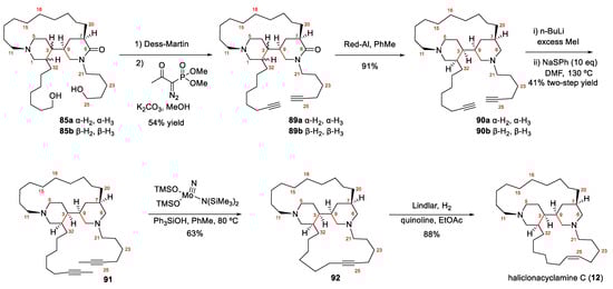 As outlined in Scheme 11, the synthesis of haliclonacyclamine C (12) began with the oxidation of isomers 85a and 85b using Dess–Martin periodinane to furnish the corresponding aldehydes, which were then treated with an excess of the Bestmann–Ohira reagent to yield the terminal diynes 89a and 89b. This mixture was subsequently reduced with Red-Al, affording a pair of diamine terminal diynes, 90a and 90b; only 90a was carried forward. Treatment of diyne 90a with n-butyllithium, followed by excess methyl iodide, led to the formation of the quaternary ammonium salt. This intermediate was then reacted with an excess of sodium thiophenoxide (10 equiv) in DMF at 130 °C, yielding the methylated diamine 91. The resulting diamine was introduced into a molybdenum-based catalyst system, and the reaction was conducted at 80 °C for 2 h, achieving the first reported alkyne metathesis of this type to form the tetracyclic alkyne 92. Finally, reduction of 92 with the Lindlar catalyst provided the fully saturated natural product haliclonacyclamine C (12).