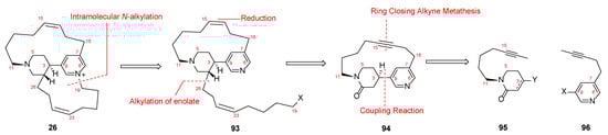 The first total synthesis of epi-tetradehydrohalicyclamine B (26), a rare tetracyclic marine pyridinium alkaloid, was reported by Dalling and Fürstner in 2022 [27]. Their innovative approach revitalized synthetic interest in the TcBPA family, demonstrating the effectiveness of modern catalytic strategies for challenging macrocyclic pyridinium frameworks. The retrosynthetic analysis (Scheme 12) utilized a convergent strategy involving four key transformations: (i) N-C19 bond formation via intramolecular N-alkylation of 93 (ii) C2-C26 bond formation in 94 via alkylation of an enolate, (iii) C3-C9 bond formation in 94 via Ni/Ir photoredox-catalyzed C-C bond construction of 95 and 96, and (iv) macrocyclization through ring-closing alkyne metathesis (RCAM) to form a C15-C16 triple bond in 94. Specifically, the synthesis began by establishing the bicyclic framework through a Ni/Ir dual photoredox catalysis, forming the critical C3-C9 bond under mild conditions. To build the tricyclic scaffold (94), a molybdenum-based alkylidyne catalyst was employed for RCAM, which successfully tolerated the presence of the pyridine nitrogen despite the inherent Lewis acidity of the Mo(VI) center. The C2-C26 bond in 93 was then introduced in the synthesis via alkylation of a suitably stabilized enolate. A challenging tertiary amide reduction was then achieved with Vaska’s complex and TMDS, yielding an enamine intermediate without affecting neighboring unsaturation or the sensitive heteroaromatic core. The final macrocyclization involved an intramolecular N-alkylation, forming the N-C19 bond and closing the 13-membered pyridinium ring. This was accomplished through deprotection of the TBDPS, iodination of the liberated primary alcohol, and thermal cyclization in refluxing acetonitrile. The transformation proceeded in 49% yield, with excellent site- and chemoselectivity, favoring the 13-membered product over a more strained and less favorable 11-membered ring.