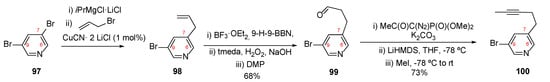 Fragment 100 (equivalent to 96) was synthesized from commercially available 3,5-dibromopyridine (97, Scheme 13) via Grignard reagent formation and copper-catalyzed alkylation to afford alkylated bromopyridine 98. Subsequent hydroboration-oxidation and Dess–Martin oxidation provided aldehyde 99, which was further converted into methylated alkyne precursor 100 via the Bestmann–Ohira homologation and methylation sequence.