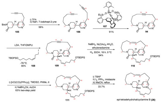 The concluding synthesis stages (Scheme 15) involved deprotection of 105, N-alkylation to produce intermediate 106, and macrocyclization via RCAM using molybdenum catalyst 107 to obtain intermediate 94. Subsequent transformations, including α-alkylation, selective cis-alkene hydrogenation, and lactam reduction, culminated in the final intramolecular N-alkylation step. This efficiently completed the total synthesis of epi-tetradehydrohalicyclamine B (26) in a cumulative 34% yield over the final three steps.
