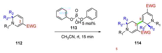 The successful synthesis of halicyclamine-type scaffolds via biomimetic transannular cyclization represents a breakthrough, spearheaded by Wayama and Oguri in 2022 and 2023 [35,36]. Earlier biomimetic strategies, inspired by the Baldwin–Whitehead hypothesis, envisioned transannular Diels–Alder cycloadditions of bis-1,6-DHP intermediates. However, these approaches were largely unsuccessful, producing only trace amounts (0.2–0.3%) of the desired cycloadducts. The main obstacle was disproportionation, driven by hydride shifts within the DHP framework, which diverted reactivity away from productive cyclization. Wayama and Oguri overcame these challenges by strategically redesigning the DHP structure and carefully tuning reaction conditions (Scheme 16). Two critical modifications were implemented: (1) geminal disubstitution at the C5 position, which eliminated hydride donors and suppressed disproportionation; and (2) incorporation of an electron-withdrawing group at C2, which directed regioselective C3 protonation and promoted C3-C9 bond formation in TcBPAs over undesired iminium reactivity at C1. These innovations enabled highly regioselective, metal-free dimerizations of 1,6-DHPs under mild Brønsted acid catalysis (Scheme 16). Specifically, diphenyl phosphate (113) catalyzed the dimerization in acetonitrile at room temperature, completing within 15 min. The optimized structural design and reaction setup led to the first successful dimerization of 1,6-DHPs (112) to form halicyclamine-type polycyclic frameworks (114), offering a generalizable strategy for the synthesis of TcBPA analogs.