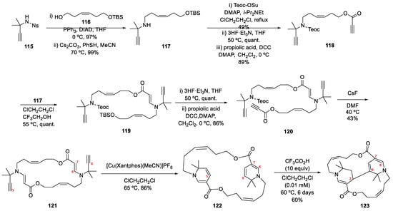 As illustrated in Scheme 17, the synthesis began with a dimethylated terminal alkyne 115, coupled with primary alcohol 116 via a Mitsunobu reaction, followed by nosyl deprotection to provide secondary amine 117. After Teoc protection and selective TBS deprotection with 3HF·Et3N, the resulting alcohol was condensed with propiolic acid to afford half-segment 118. A heteroconjugate addition between 117 and 118 generated intermediate 119 in quantitative yield, and a second round of deprotection and condensation yielded the other half-segment 120. Macrocyclization to form 121 was achieved through Teoc deprotection (using CsF in DMF), followed by Cu(Xantphos)(MeCN)PF6-catalyzed ring closure, forming bis-1,6-DHP macrocycle 122. The key transannular cyclization was induced under highly diluted conditions (0.01 μM) in the presence of trifluoroacetic acid at 60 °C for six days, furnishing the halicyclamine-type scaffold 123. This metal-free, atom-economical, and chemoselective 11-step synthesis represents a powerful realization of a long-speculated biosynthetic hypothesis. It offers an efficient platform for accessing the halicyclamine chemical space, enabling further exploration of TcBPA analogs for both biological and synthetic investigations.