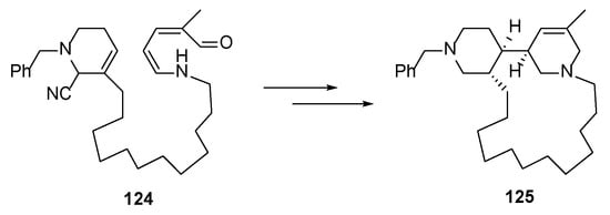 Efforts to access the complex polycyclic frameworks of TcBPAs have historically relied on model studies designed to probe key structural motifs and test biosynthetic hypotheses. One of the earliest and most influential contributions came from Baldwin, who proposed that manzamine and TcBPA alkaloids could arise via intramolecular Diels–Alder reactions of bis-DHPs or bis-iminium salts (e.g., 34, 38, 41). While this approach led to the successful formation of tetracyclic cores in trace amounts, it was hampered by low yields due to competing disproportionation pathways, driven by intramolecular hydride shifts [32]. Seeking to improve on Baldwin’s concept, Jakubowicz and co-workers [31] developed a series of aminopentadienal-based model reactions (e.g., Scheme 5), exploring their condensation with 5,6-dihydropyridinium salts. Their results demonstrated regioselective formation of TcBPA-like scaffolds with yields superior to earlier methods. Although some products exhibited inverted stereochemistry, the study offered strong support for a modified biosynthetic hypothesis and extended its scope to related frameworks such as sarain A. In a conceptually similar approach, Sinigaglia et al. [39] achieved the formation of a monomacrocyclic halicyclamine A model (125) by condensing a 5-aminopenta-2,4-dienal with a masked dihydropyridinium intermediate (Scheme 18). Despite its simplicity, this strategy effectively demonstrated the feasibility of macrocyclization Via aminopentadienal addition, yielding structurally relevant products in moderate yield. Taking a biogenetically inspired angle, Sanchez-Salvatori and Marazano [33] reported a successive condensation sequence involving malondialdehyde derivatives, aldehydes, and primary amines. Their route generated stable bicyclic intermediates resembling the halicyclamine core (Scheme 6). Although anticipated cycloaddition adducts related to manzamine alkaloids were not observed, the ability to access tetraaldehyde-like structures provided rare experimental support for proposed biosynthetic precursors. Meanwhile, efforts to construct bis(piperidine) frameworks through more modular approaches have also been fruitful. Lansakara et al. [7] employed the alkylidene dihydropyridine 127 as an intermediate in a stereoselective synthesis of xestoproxamine C analog (128) (Scheme 19), leveraging RCM followed by diastereoselective hydrogenation to achieve controlled assembly of a tricyclic bis(piperidine) motif. Complementing this work, Banwell et al. [40] developed an aldol-based strategy to construct a series of bis(piperidine) derivatives (e.g., 130), starting from readily available 1-benzyl-4-piperidinone (129) (Scheme 20). Their method demonstrated the versatility of α-keto dianion chemistry and yielded unsaturated analogs that preserved biological activity similar to natural haliclonacyclamines, supporting the pharmacological relevance of this substructure. Finally, Molander and colleagues [41] reported a strategic advance in stereocenter construction Via a diastereoselective intramolecular Diels–Alder reaction, aimed at assembling the stereogenic triad (132) of halicyclamine A (16) (Scheme 21). Although the total synthesis was not completed, the team successfully prepared an advanced intermediate bearing three contiguous stereocenters, establishing a foundation for future synthetic development of TcBPAs.