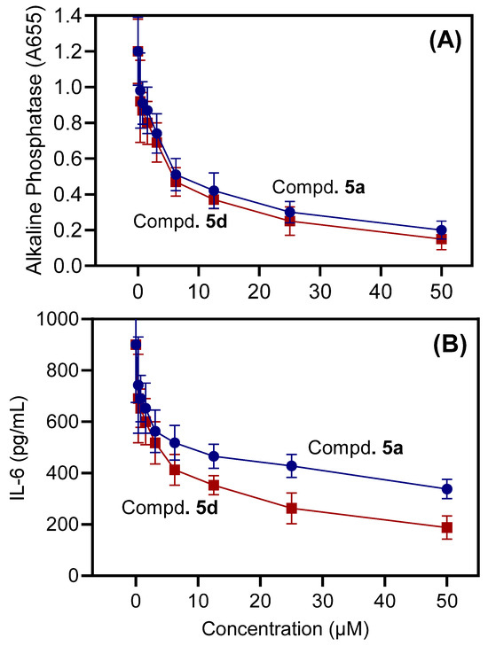 Compounds lacking cytotoxic activity were further evaluated for anti-inflammatory activity. Anti-inflammatory activity was assessed by determining the compound’s capacity to inhibit lipopolysaccharide (LPS)-induced NF-κB/AP-1 activity in THP-1Blue monocytic cells, as this pathway is essential in phagocyte inflammatory responses [42]. We also evaluated the effect of compounds on IL-6 production by MonoMac-6 monocytic cells. Compounds 5a and 5d were relatively potent inhibitors of NF-κB/AP-1 reporter activity in THP-1Blue cells, with IC50 values < 6.1 μM (Table 3). As an example, the dose-dependent inhibition of LPS-induced NF-κB/AP-1 activity by compounds 5a and 5d is shown in Figure 1A. Compounds 5a and 5d also inhibited IL-6 production in MonoMac-6 cells (Table 3). As an example, the dose-dependent inhibition of LPS-induced IL-6 production is shown in Figure 1B. These results indicate that alkylation of the oxime group (compounds 5b, 5c, 5e, and 5f) led to the loss of biological activity, indicating that the unsubstituted oxime function =N-OH is important for effective kinase binding.