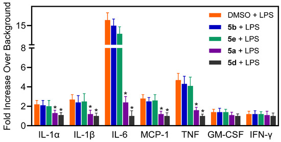 Effect of compounds 5a, 5b, 5d, and 5e on proinflammatory cytokine production in MonoMac-6 cells. Human MonoMac-6 monocytic cells were pretreated with 10 μM of the tested compounds or DMSO for 30 min, followed by addition of 250 ng/mL LPS or buffer for 24 h. Production of cytokines in the supernatants was evaluated using a Multiplex human cytokine ELISA kit. The relative level of cytokine production is shown as the fold increase over background (i.e., 1% DMSO control, without LPS). The data are presented as the mean ± S.D. of triplicate samples from one experiment that is representative of two independent experiments. * p < 0.05 in comparison with the control group (DMSO + LPS).