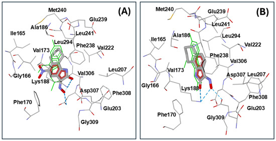 Docking poses of compounds 5d (A) and 5a (B) in DYRK1A binding site (PDB code 3ANQ). The co-crystallized ligand INDY [(1Z)-1-(3-ethyl-5-hydroxy-1,3-benzothiazol-2(3H)-ylidene)propan-2-one] is represented by thin green sticks. Residues within 4 Å from each pose are visible.