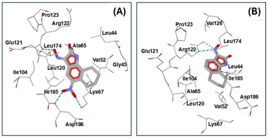 We also performed molecular docking of compounds 5a, 5d, and 5f into another important kinase, PIM1 (PDB: 2OBJ). The nitro group of 5d had strong hydrogen bonding interactions with Lys67 and Asp186 of PIM1, which may be responsible for different orientation of the molecule compared to 5a. Additionally, the oxime OH group of 5d formed a hydrogen bond with Glu121 (Figure 4A, Table 5). On the other hand, molecule 5a had quite a different orientation in the binding site and was H-bonded to Arg122, with participation of the oxime nitrogen atom (Figure 4B). Additionally, the compounds 5a and 5d overlapped significantly with the position of the co-crystallized pyridone ligand (6-(5-bromo-2-hydroxyphenyl)-2-oxo-4-phenyl-1,2-dihydropyridin-3-carbonitrile) present in the PDB 2OBJ structure [48]. It should be noted that the nitro-derivative 5d had a more negative interface score than compound 5a, in accordance with a higher binding affinity to PIM1. The inactive O-Ethyl oxime 5f and low-activity compound NS-383 (based on binding affinity toward PIM1, see Table 4) were characterized by a lower interface score (Table 5). These results, along with the data obtained for the docking of compound 5f into DYRK1A (see above), highlight the importance of the unsubstituted oxime group =N-OH for effective binding to the investigated kinases.