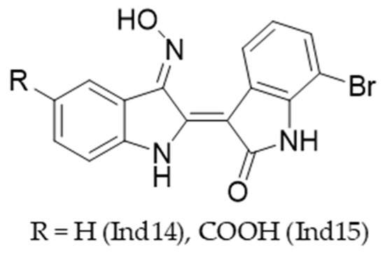 It should be noted that indirubin oximes Ind14 and Ind15 (Figure 5) were reported to demonstrate high affinity for various kinases, including DYRK1A potential [25]. Of these, the carboxylic acid derivative Ind15 acts as an inhibitor of both DYRK1A and DYRK2 [49]. Structurally, Ind14 and Ind15 contain indoline moieties and an unsubstituted oxime group, similar to isatins 5a and 5d. However, compounds 5a–f are based on a structurally distinct tricyclic scaffold compared to the indirubin derivatives.