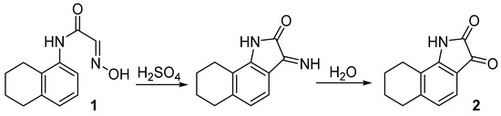 One of the methods for isatin ring formation utilizes Sandmeyer isatin synthesis [37], which uses unsubstituted oximes based on acetanilides. Sandmeyer intramolecular cyclization occurs in strongly acidic media and involves the ortho-carbon atom, resulting in formation of a fused pyrrole ring containing carbonyl and imino groups in positions 2 and 3, respectively. The imino group of this intermediate can be readily hydrolyzed to form the second carbonyl group of the isatin. The Sandmeyer cyclization of 2-(hydroxyimino)-N-(5,6,7,8-tetrahydronaphthalen-1-yl)acetamide (1) to the NS-102 precursor 6,7,8,9-tetrahydro-1H-benzo[g]indol-2,3-dione (2) is represented in Scheme 1.