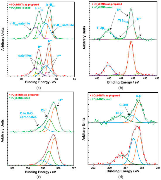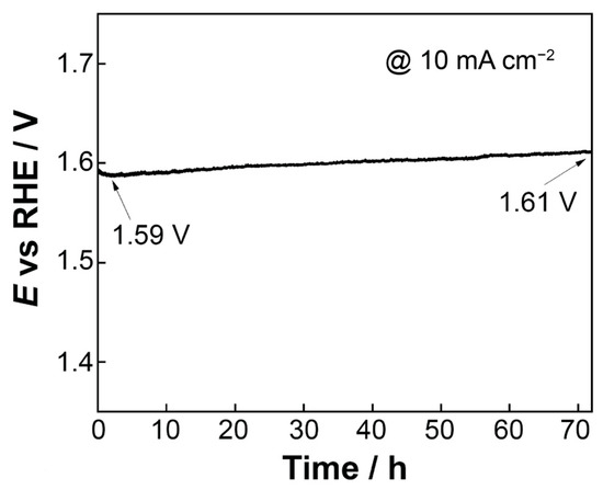 - The open-structure IrOx(Ni)/bTNTs (more precisely, IrOx/bTNTs since no Ni has been detected after the galvanic replacement/metal exhange process), exhibited an enhanced activity towards the OER. This can be attributed to the higher surface area of the support, higher Ir dispersion and catalytic activity (due to IrO2-bTNT interactions) as well as less pore clogging during O2 evolution. An overpotential of η = 240 mV at 10 mA cm−2 and a mass-specific current density of 258 mA mgIr−1 at η = 300 mV has been recorded, rendering them comparable or better than similar electrodes reported in the literature (in the 30–140 mA mgIr−1 range at η = 300 mV and in the η = 240–360 mV range at 10 mA cm−2 [54,58,92,93]). Furthermore, the optimized electrodes, when tested for prolonged periods of time under OER conditions, were characterized by good short-term (72 h) stability.
