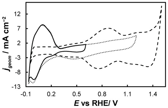 - 0.0 VRHE to +0.6 VRHE, corresponding to the potential range between the onset of hydrogen evolution and the end of Ir double layer potential region [76,77], for the electrochemical dissolution of any surface uncovered/unreacted Ni and the formation of an Ir(Ni) mixed core–skin structure [65] in the samples that contain Ni, until only the peaks attributed to the adsorption and desorption of an under-potentially deposited hydrogen (UPD-H) layer on metallic Ir could be clearly recorded, as depicted indicatively in Figure 4 for the case of open-structure Ir/bTNTs. The electrochemical surface area (ECSA) of metallic Ir is related to the charge associated with the adsorption of a H monolayer on Ir; the former could be calculated from the voltammograms of Figure 4 (by integration of the anodic/H-desorption peak between −0.05 and 0.30 V) as 21.8, 49.4, and 239 cm2Ir cm−2 for the close-packed Ir(Ni)/TNTs, the close-packed Ir(Ni)/bTNTs, and the open-structure Ir/bTNTs, respectively [15,64,78], in line with the increase in IrO2 coating roughness/particle dispersion depicted in Figure 2, Figure 1c, and Figure 1d, respectively, that correspond to these three different electrode types.