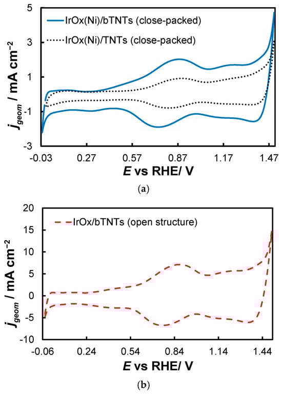 - 0.0 VRHE to +1.5 VRHE, for the electrochemical anodization of metallic Ir to different oxidation states (IV, V) in order to form stable, porous 3D-IrOx, which also extends to the interior of the material [79,80,81]. In Figure 5, the electrochemistry due to anodically generated IrOx appears above +1.0 VRHE [67,82,83]. From the CVs, the charge corresponding to Ir oxides, which is representative of the electroactive surface area available for OER [84,85,86], was calculated (by integration of the anodic/IrOx formation peaks between 0.30 and 1.40 V) as 16.6, 26, and 80 mC cm−2 for the close-packed IrOx(Ni)/TNT and IrOx(Ni)/bTNTs, as well as the open-structure IrOx/bTNTs, respectively (again, in line with coating roughness/particle dispersion shown in the SEM micrographs of Figure 1 and Figure 2). Taking into account the mass loading of Ir (see Section 2.1 above), the mass specific electroactive area/oxide charge of the IrOx/bTNT electrode can thus be estimated as 267 C gIr−1, a value that compares favorably with those of commercial IrO2 powder electrodes (100–200 C gIr−1 [19,85]) and IrO2 supported on TiO2 powder electrodes (54–125 C gIr−1 [19]).