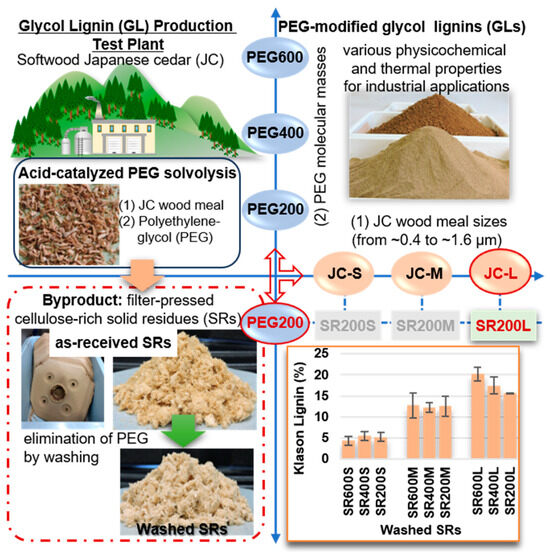GL production from JC with three different wood meal sizes (JC-L (~1.6 mm) > JC-M (0.8 mm) > JS-S (~0.4 mm)) and PEG with three different molecular masses (PEG600 > PEG400 > PEG200) [5] yielded nine filter-pressed SR samples (see Figure 1). The unreacted PEG and a certain amount of lignin remaining in the as-received SRs were eliminated by washing with water and applying two successive purification (bleaching) processes. After three successive washings, the dried weight of the washed SRs was approximately one third of the initial wet weight of the as-received SRs. Next, the Klason lignin content (Figure 1) of the washed SRs was analyzed, suggesting that increasing the wood meal size and PEG molecular mass in the solvolysis reaction increased the residual lignin content.
