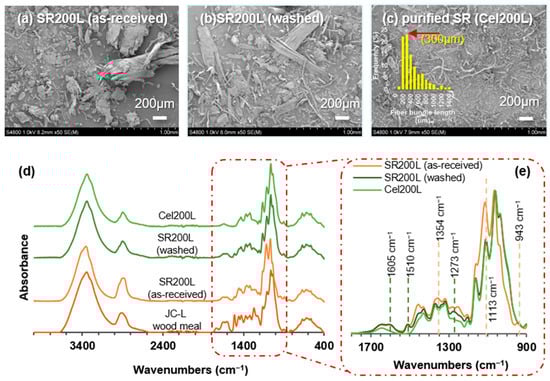FE–SEM images of SR200L (a) as-received and (b) after washing to eliminate unreacted PEG200, (c) purified cellulose fiber bundles of Cel200L, and (d,e) purification process monitored by ATR-FTIR spectral analysis.