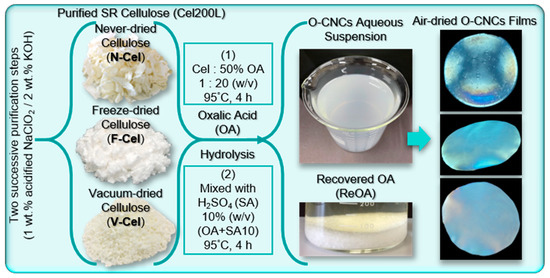 The CNCs were prepared from purified cellulose Cel200L as shown in Figure 3. Some portions of the never-dried Cel200L (N-Cel) were freeze-dried (F-Cel) or vacuum-dried and milled (V-Cel). Based on a preliminary trial test, in which the hydrolysis time was varied from 2 to 6 h, the different forms of Cel200L (N-Cel, F-Cel, and V-Cel) were hydrolyzed with OA at 95 °C for 4 h. Briefly, 5 g of purified cellulose sample was added to the 100 mL of 50 wt% aqueous OA solution. The OA had been completely dissolved at 95 °C in advance and the reaction slurry was constantly stirred at 95 °C for 4 h. Each reaction was terminated by adding 200 mL of distilled water followed by two successive centrifugations at 3300 rpm for 5 min to remove the hydrolysate containing unreacted OA. This solution was kept in a cold room (~10 °C) overnight to precipitate the recrystallized OA (ReOA). The recovered ReOA was collected by vacuum filtration, rinsed with distilled water, and vacuum-dried for reuse in the next hydrolysis reaction.
