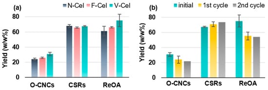 Yields of O-CNCs, remaining cellulosic solid residues (CSRs), and recovered oxalic acid (ReOA) from hydrolysis of (a) different forms of starting cellulose materials (N-Cel, F-Cel, and V-Cel) and (b) V-Cel using recycled oxalic acid (ReOA).