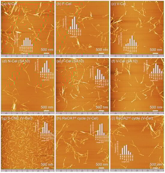 Topographic SPM images of the CNCs isolated from (a,d) N-Cel, (b,e) F-Cel, (c,f–i) V-Cel through oxalic acid (OA) hydrolysis alone (a–c), OA and 10 wt% sulfuric acid (SA10) hydrolysis (d–f), SA hydrolysis alone (g), and recycled OA (ReOA) hydrolysis (h,i). Insets show the length distributions of the corresponding CNCs (see Figure S1).