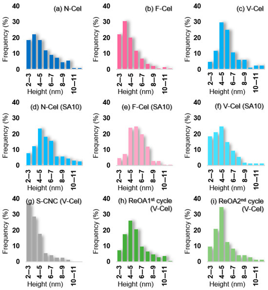 SPM-derived height (width) distributions of CNCs isolated from (a,d) N-Cel, (b,e) F-Cel, (c,f–i) V-Cel through oxalic acid (OA) hydrolysis alone (a–c), OA and 10 wt% sulfuric acid (SA10) hydrolysis (d–f), SA hydrolysis alone (g), and recycled OA (ReOA) hydrolysis (h,i).