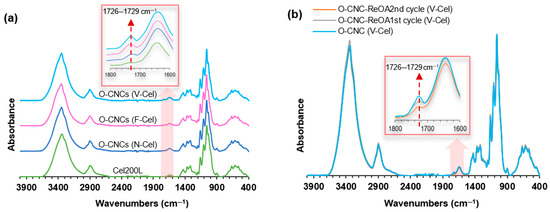 ATR-FTIR spectra of (a) O-CNCs prepared from OA hydrolysis of N-Cel, F-Cel, and V-Cel and (b) O-CNCs-ReOA using recycled OA. The spectra in (a,b) are compared with the spectra of Cel200L and O-CNCs isolated using fresh OA, respectively.