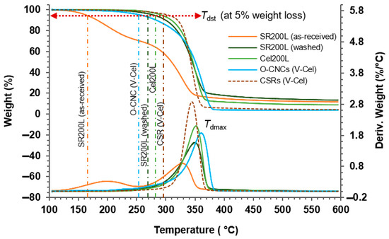 Thermogravimetric analyses (TGA) of the as-received SR200L, washed SR200L, Cel200L, and O-CNCs and their corresponding CSRs were conducted on a Q500TGA analyzer (TA Instruments-Water LLC, New Castle, DE, USA) under an N2 atmosphere. The thermal properties—the thermal decomposition starting temperature at 5% weight loss (Tdst), maximum thermal decomposition temperature (Tdmax), and charred residue content at 600 °C—are summarized in Table 3. Among these parameters, Tdst defines the thermal stability of the cellulosic materials. The transformation of TGA and differential TGA plots from as-received SR200L to O-CNCs (V-Cel) and CSRs (V-Cel) is presented in Figure 9.