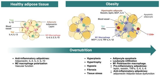 In hypertrophic adipose tissue, the predominant infiltrating immune cells are macrophages and CD8+ T lymphocytes. CD8+ T cells not only potentiate macrophage recruitment and activation but also promote their polarization toward a pro-inflammatory M1 phenotype in collaboration with adipocytes [11,12,13,14]. M1 macrophages contribute to adipose tissue dysfunction by producing interleukin (IL)-1β, while both macrophages and adipocytes enhance the secretion of pro-inflammatory mediators such as tumor necrosis factor alpha (TNF-α), IL-6, chemoattractant protein of monocytes-1 (MCP-1), and resistin. Simultaneously, adipocyte-derived anti-inflammatory adipokines, particularly adiponectin, are downregulated. These processes create a self-perpetuating cycle of leukocyte recruitment, inflammatory cytokine production, and suppression of anti-inflammatory signals, thereby sustaining chronic low-grade inflammation within the adipose tissue [11,12,16].