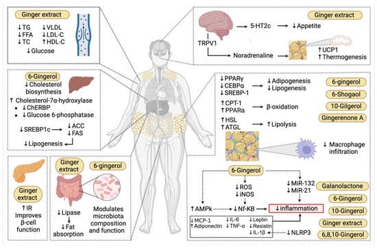 Since obesity is characterized by a chronic low-grade inflammatory state, involving sustained activation of the innate immune system [39]. Several in vitro studies have elucidated mechanisms by which ginger compounds regulate the synthesis of inflammatory mediators, modulating cellular activity and the transcriptional regulation of inflammation-associated genes.