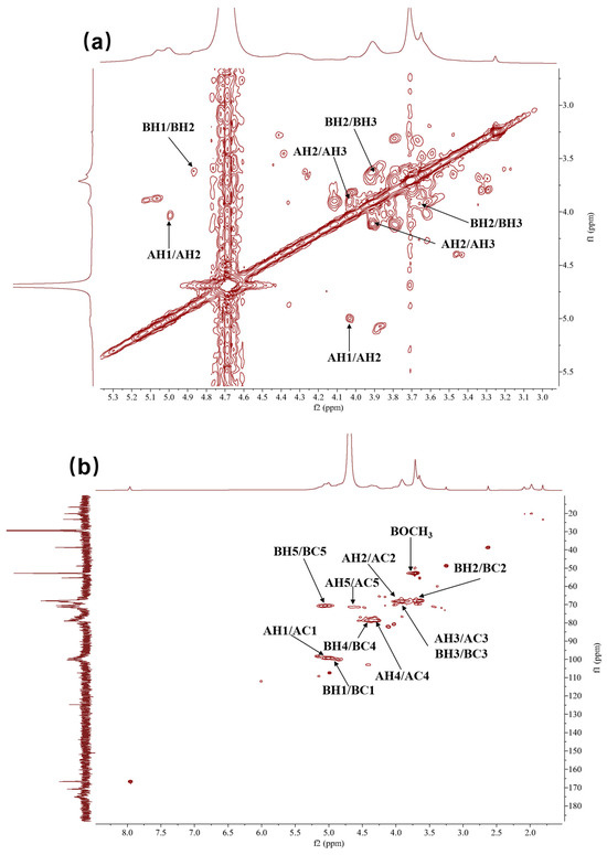 The existence of →4)-α-D-GalA(6-OCH3)-(1→ was determined from NMR data and reference [28]. Peaks at δC 100.37 (C-1) and δH 4.87 (H-1) ppm were the typical anomeric carbohydrate signals of →4)-D-GalA(6-OCH3)-(1→ (Figure 3a,b); H-l (δH 4.87 ppm) and H-2 (δH 3.65 ppm) exhibited COSY correlations; the δH 3.65 ppm signal corresponds to H-2 (Figure 4a). H-2 (δH 3.65 ppm) and H-3 (δH 3.91 ppm) showed COSY correlations, identifying δH 3.91 ppm as the H-3 signal (Figure 4a). δH 3.71 ppm and δC 52.83 ppm were hydrogen and carbon signals of the -OCH3 group. ΔH 3.71 ppm and δC 170.74 ppm exhibited HMBC correlations, so that δH 3.71 ppm and δC 52.83 ppm were confirmed to be 6-position carboxylic acid ester signals (Figure 4c). H-5 (δH 5.05 ppm) and C-6 (δC 170.74 ppm) showed HMBC correlations, so it was determined that δH 5.05 ppm was the H-5 signal (Figure 4c). H-1 (δH 4.87 ppm) and H-5 (δH 5.05 ppm) showed NOESY correlations, assigning δH 4.87 ppm to H-1 (Figure 4d). H-1 (δH 4.87 ppm) and H-4 (δH 4.38 ppm) exhibited NOESY correlations, confirming the δH 4.38 ppm as the H-4 signal (Figure 4d). The elevated chemical shift of C-4 (δC 79.03 ppm) indicated glycosidic linkage, confirming the structure as →4)-α-D-GalA(6-OCH3)-(1→ (Figure 3b).