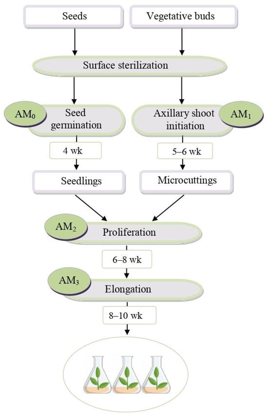 Flowchart of rhododendron micropropagation stages, excluding rooting and acclimatization. AM—basal Anderson’s medium: AM0—1/2 mineral nutrients, hormone-free; AM1—AM + 30–50 mg/L ascorbic acid + 0.5 mg/L IAA* + 2 mg/L 2iP**; AM2—AM + 4 mg/L IAA + 15 mg/L 2iP; AM3—AM + 1 mg/L IAA + 5 mg/L 2iP. *IAA—β-indoleacetic acid, **2iP—N6-2-isopentenyladenine.