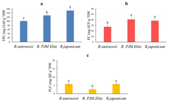 The total phenolic content—TPC (a), flavanol content—FC (b), and flavonol content—FLC (c) in microshoots of various Rhododendron species. Results are expressed as means ± SD, n = 3. The significant differences at p < 0.05 are indicated by different Latin letters.