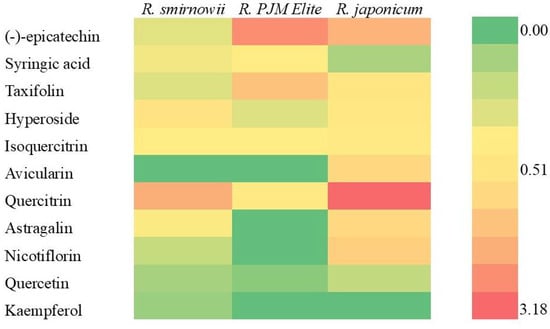 At the same time, there were interspecific differences in the composition of individual components of the flavonol complex (Figure 4). Thus, in R. japonicum, quercitrin (quercetin-3-O-α-L-rhamnoside), nicotiflorin (kaempferol-3-O-rutinoside), and avicularin (quercetin-3-O-α-L-arabinoside) predominated; in R. smirnowii, quercitrin and hyperoside (quercetin-3-β-D-galactoside); in R. PJM Elite, quercitrin and isoquercitrin (quercetin-3-O-glucopyranoside).